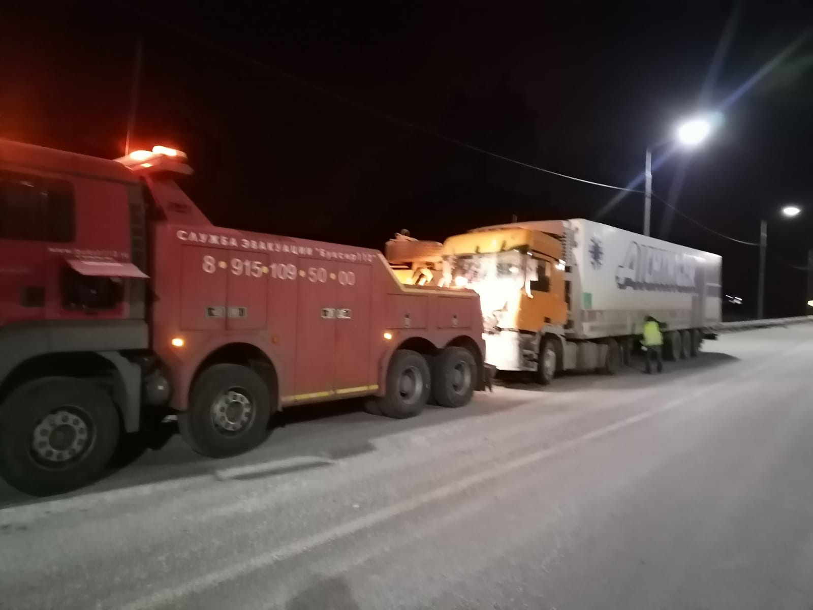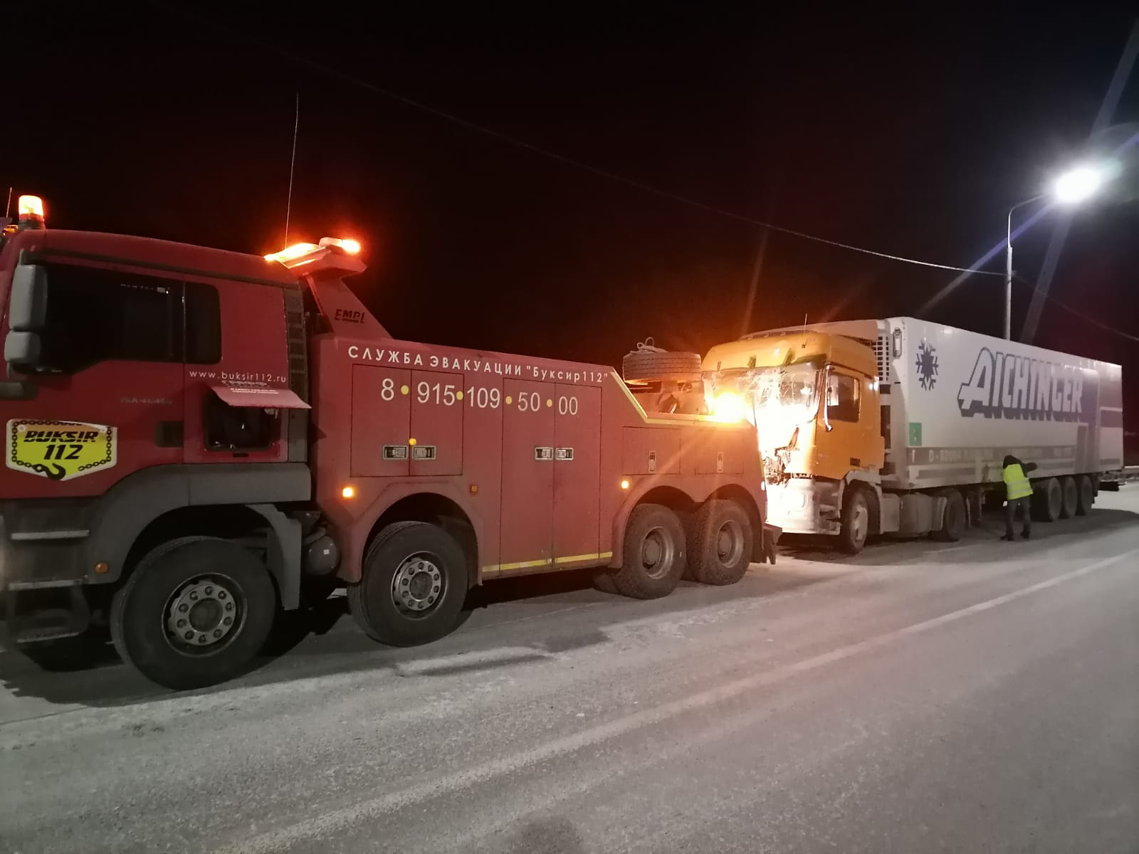 Пока сотрудники “Буксир-112” проводили крепление между буксиром и транспортным средством, другой грузовик влетел в наш буксировщик. Отбуксировали до места ремонта оба грузовика.