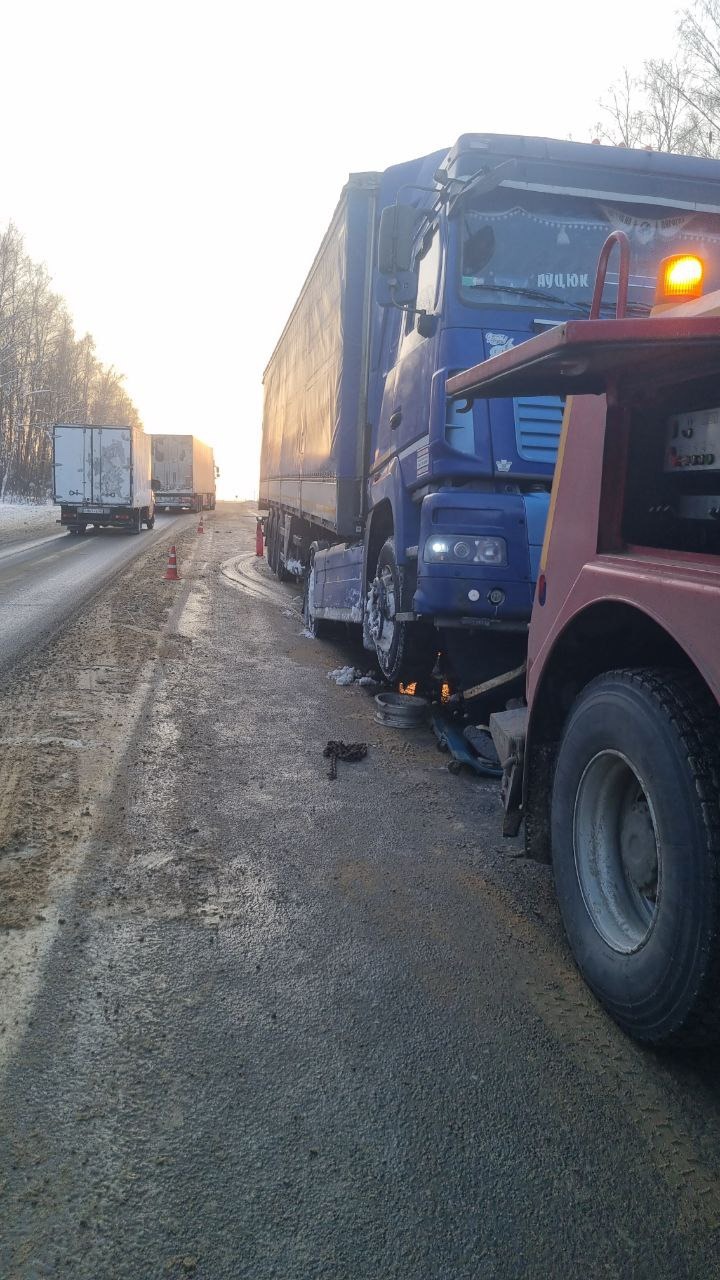 Картина, открывшаяся нашим специалистам по прибытии, была сложной. Первая фура, белый рефрижератор, лежала на боку ближе к началу участка. Ее удалось поднять еще на прошлой неделе. Но главный вызов ждал впереди. Вторая машина, ярко-синий грузовик, находилась в ста метрах от первой. Это был современный груженый рефрижератор на пневматической подвеске, буквально "лежащий на пузе" в глубоком кювете. Вся его красота — многочисленные обтекатели, спойлеры, сложная аэродинамика кузова — делала задачу ювелирной. Любое неосторожное движение, любой резкий рывок могли превратить эвакуацию в катастрофу с миллионными повреждениями.