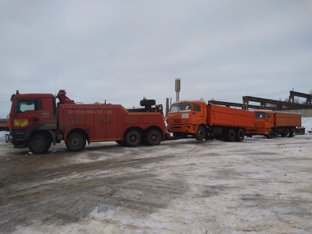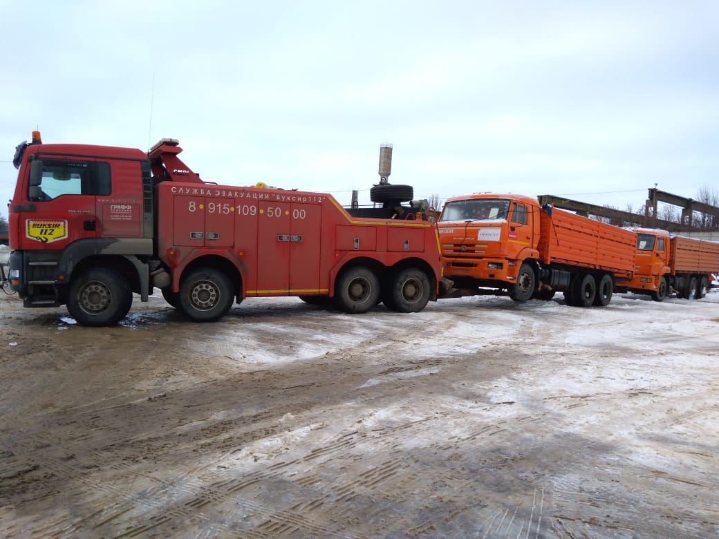 Специалисты нашей компании выполнили одновременную буксировку двух грузовых автомашин! Буксировка первого КАМАЗа выполнена за переднюю балку, Второй КАМАЗ буксируется при помощи жесткой сцепки к первому.