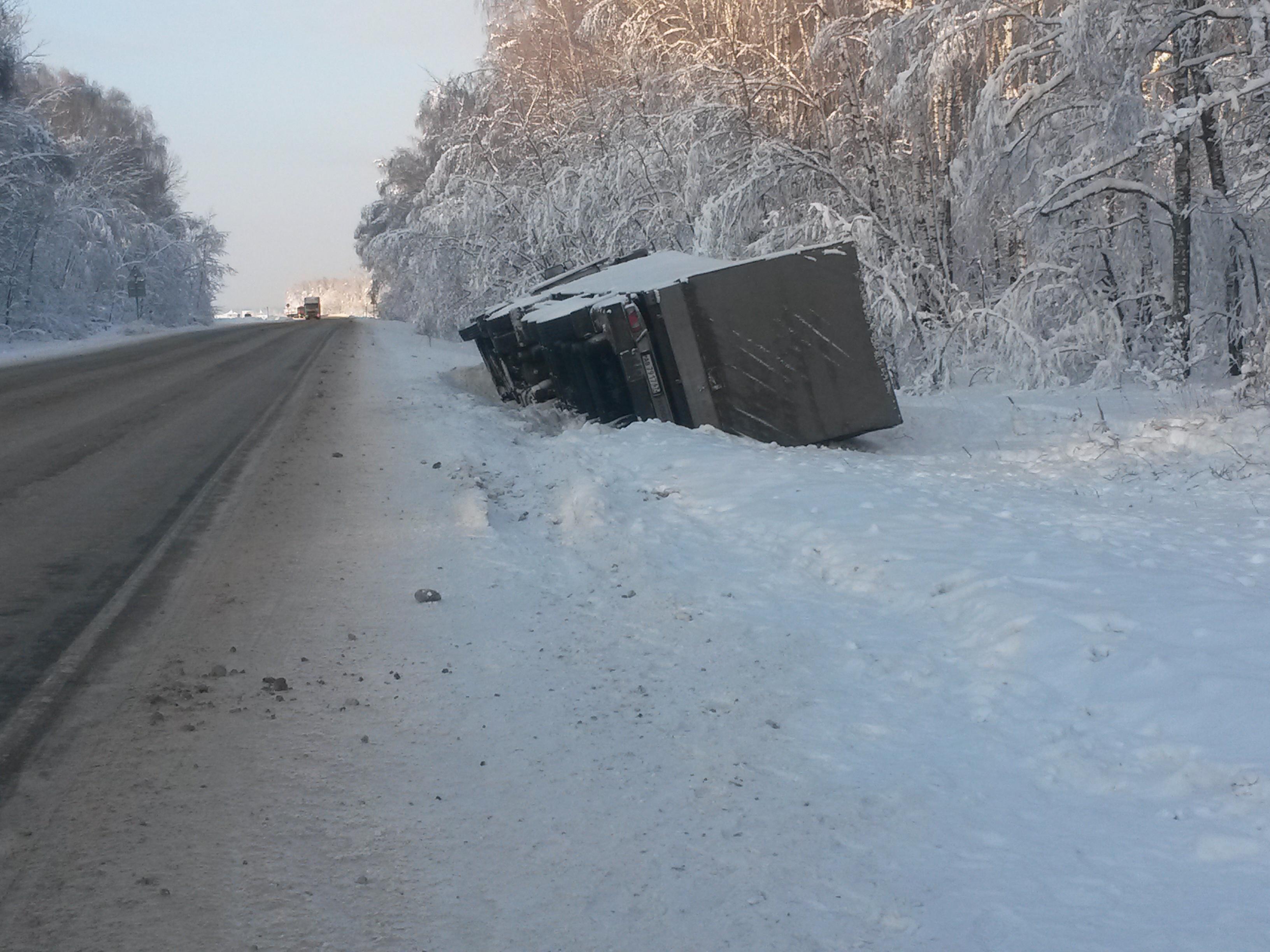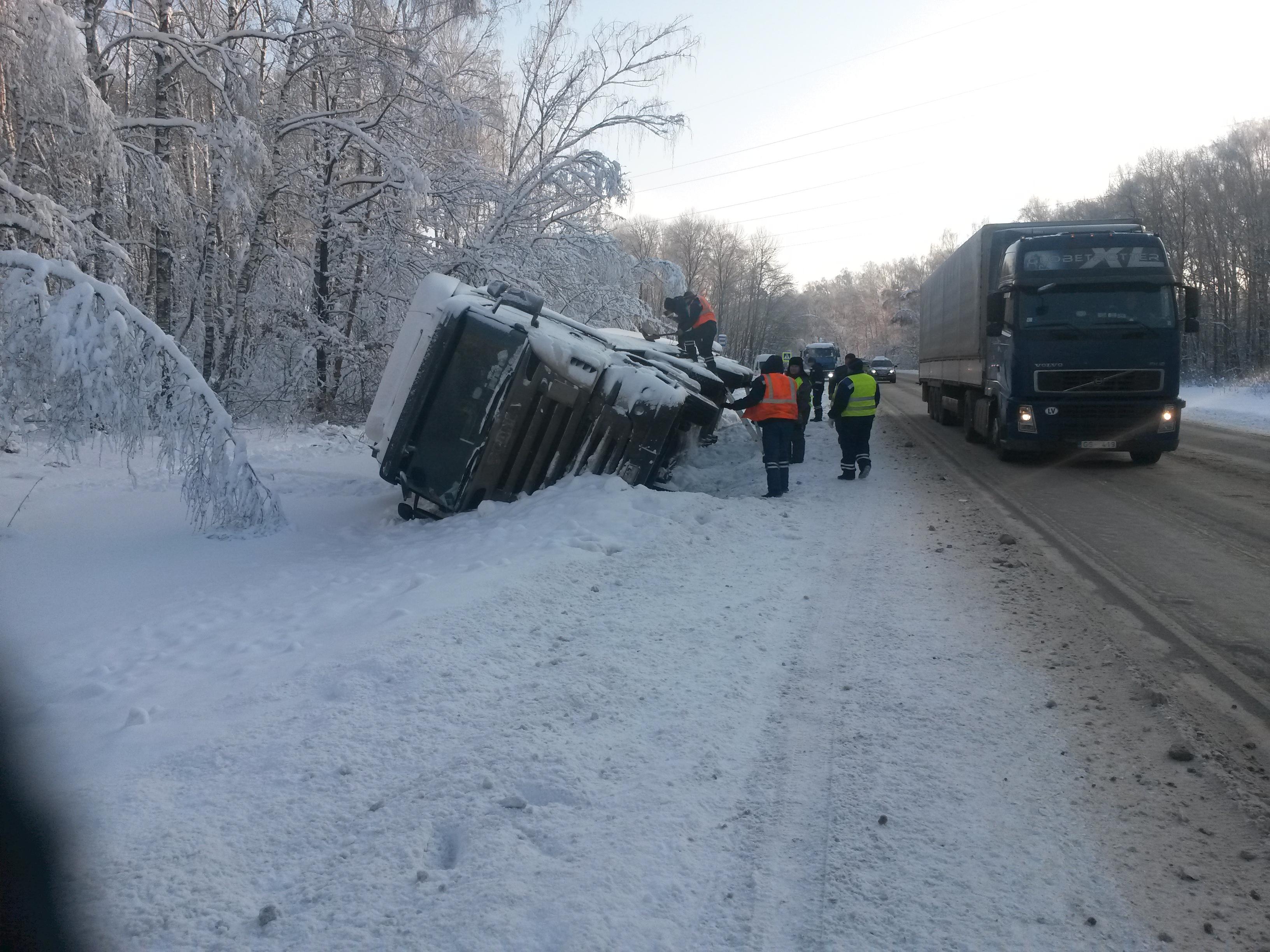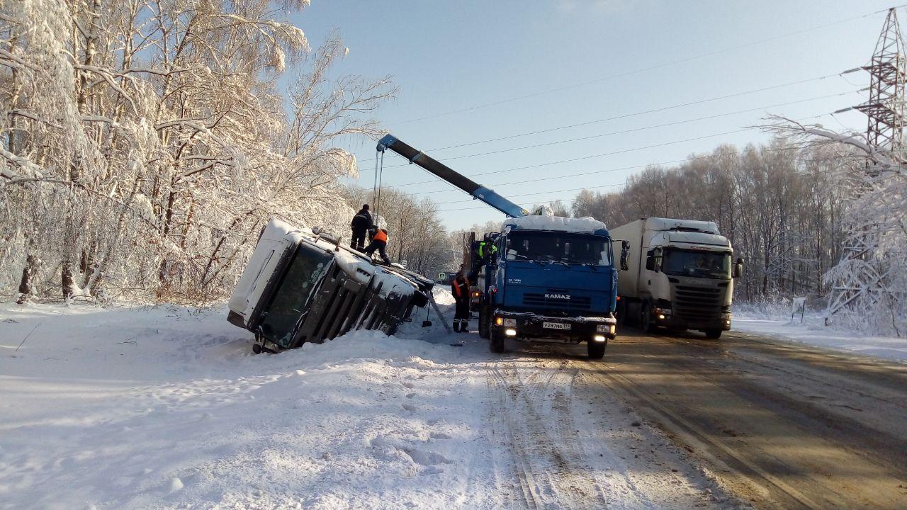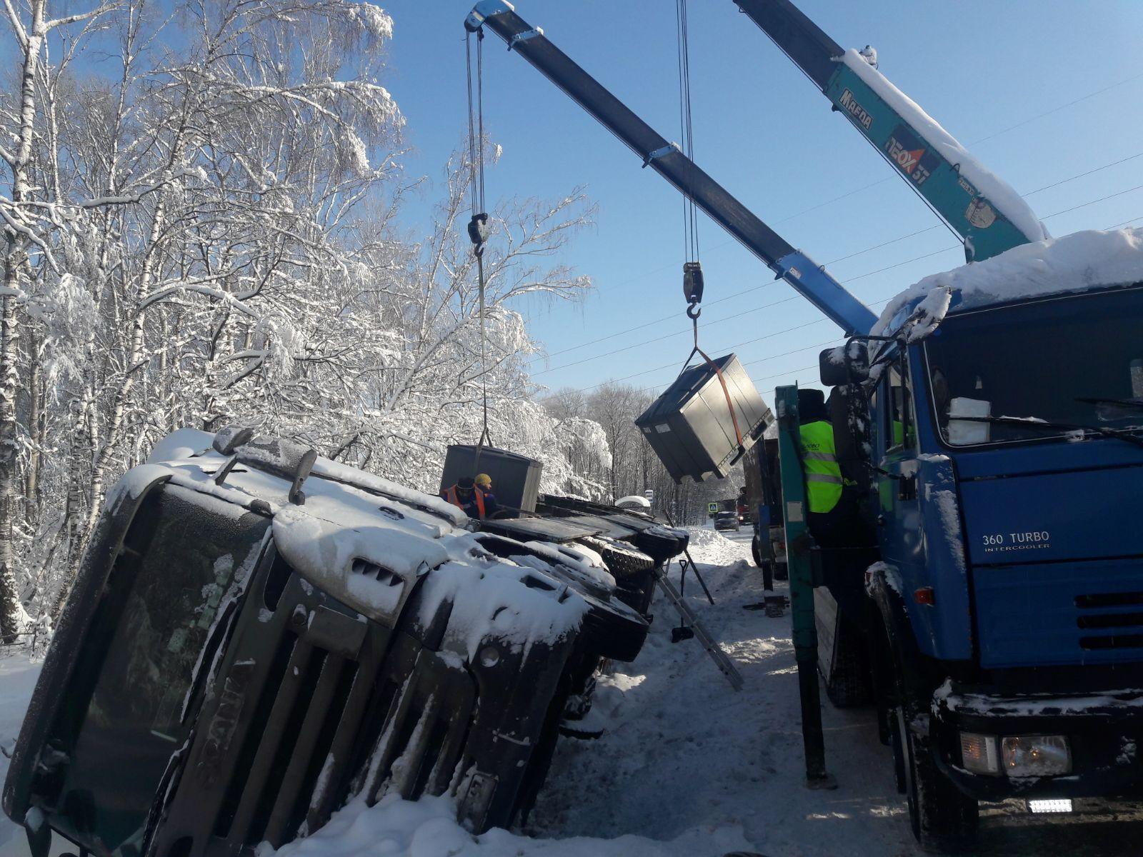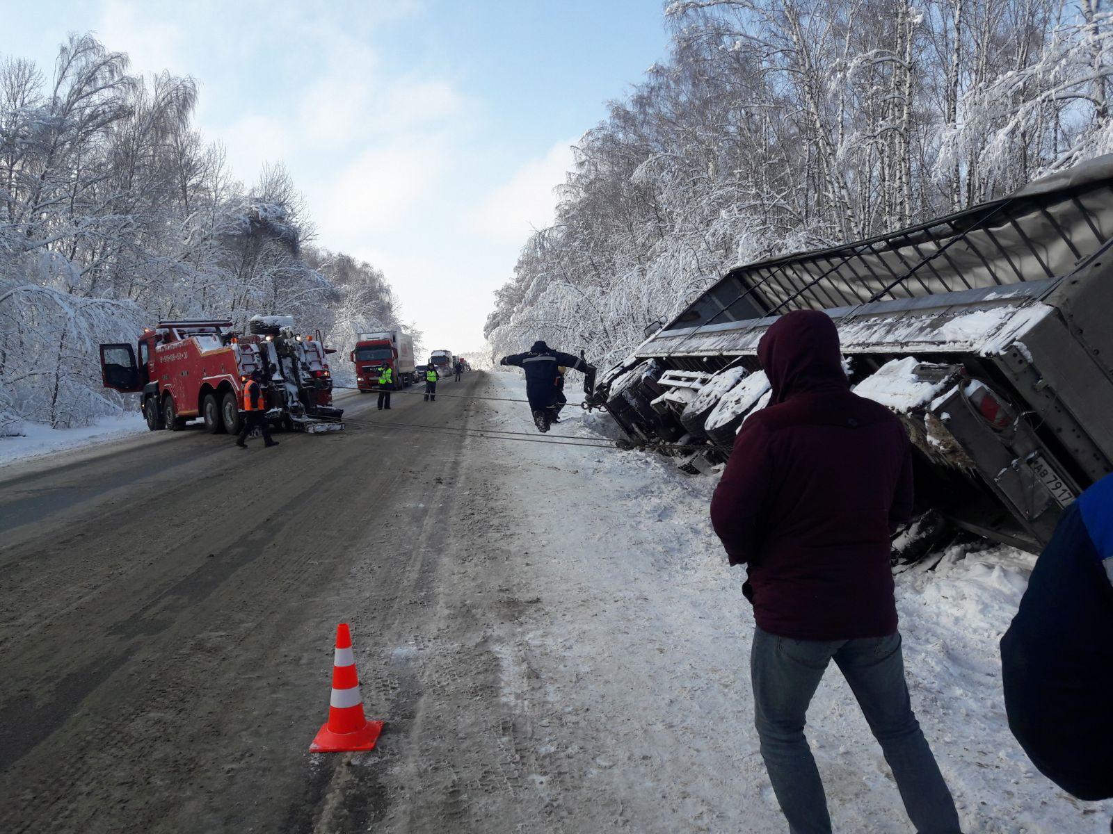 Фура, груженная паллетами, не справилась с управлением на скользкой дороге и упала в кювет. Водитель вызвал команду «Буксир-112». Уже в телефонном разговоре он объяснил ситуацию, поэтому специалисты, приехавшие на место происшествие, были готовы к решению задачи.