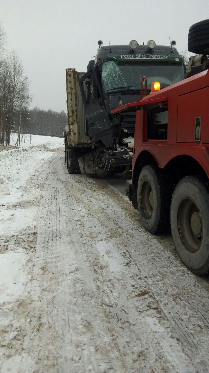 На трассе А8, в районе г. Боровск, произошла серьезная авария. Водитель грузового автомобиля не захотел пропускать встречную машину. В результате столкновения у грузового транспортного средства произошло смещение основной конструкции на 1 метр и сгиб рамы. Передний мост был вырван из-за удара огромной силы. Транспортные средства двигались на довольно внушительной скорости.