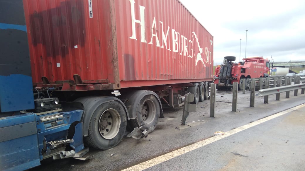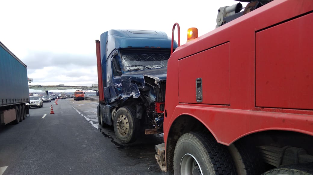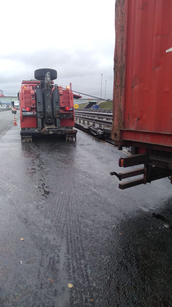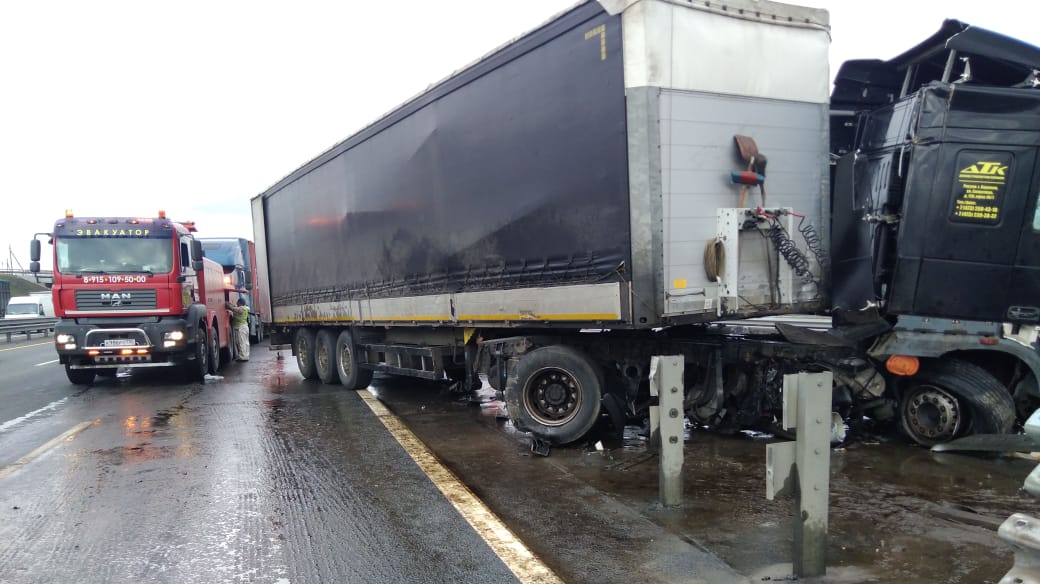 На федеральной трассе М-2 столкнулись две грузовые машины. В итоге столкновения обе машины «повисли» на отбойниках. Водители вызвали специалистов компании «Буксир-112», чтобы они помогли им в этой проблеме.
