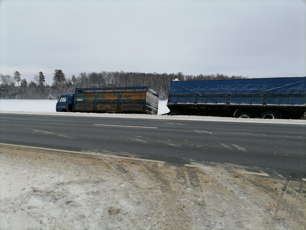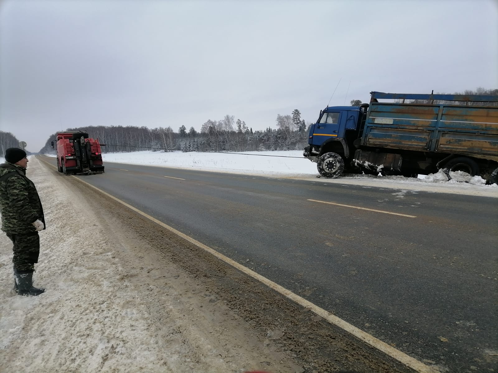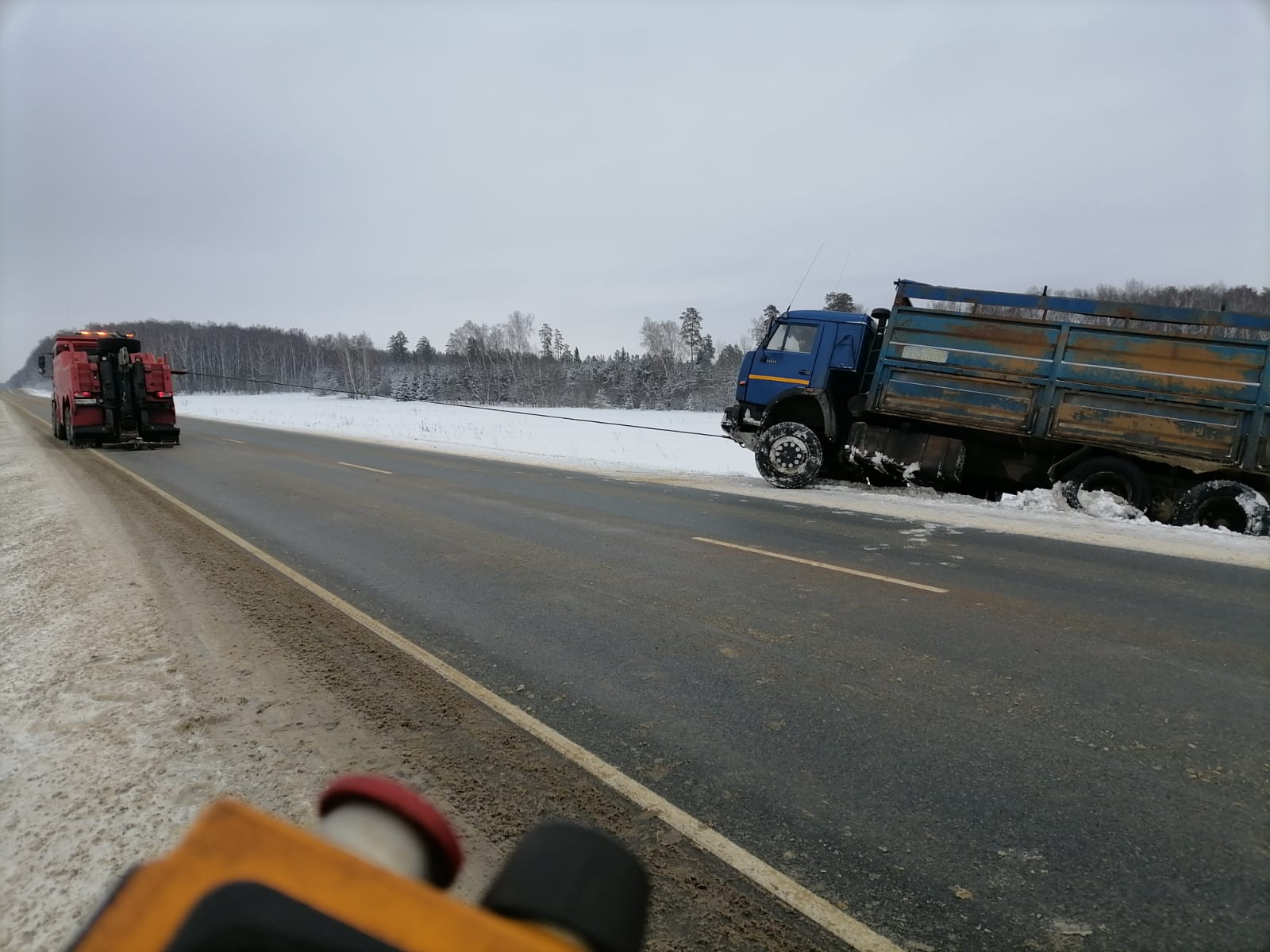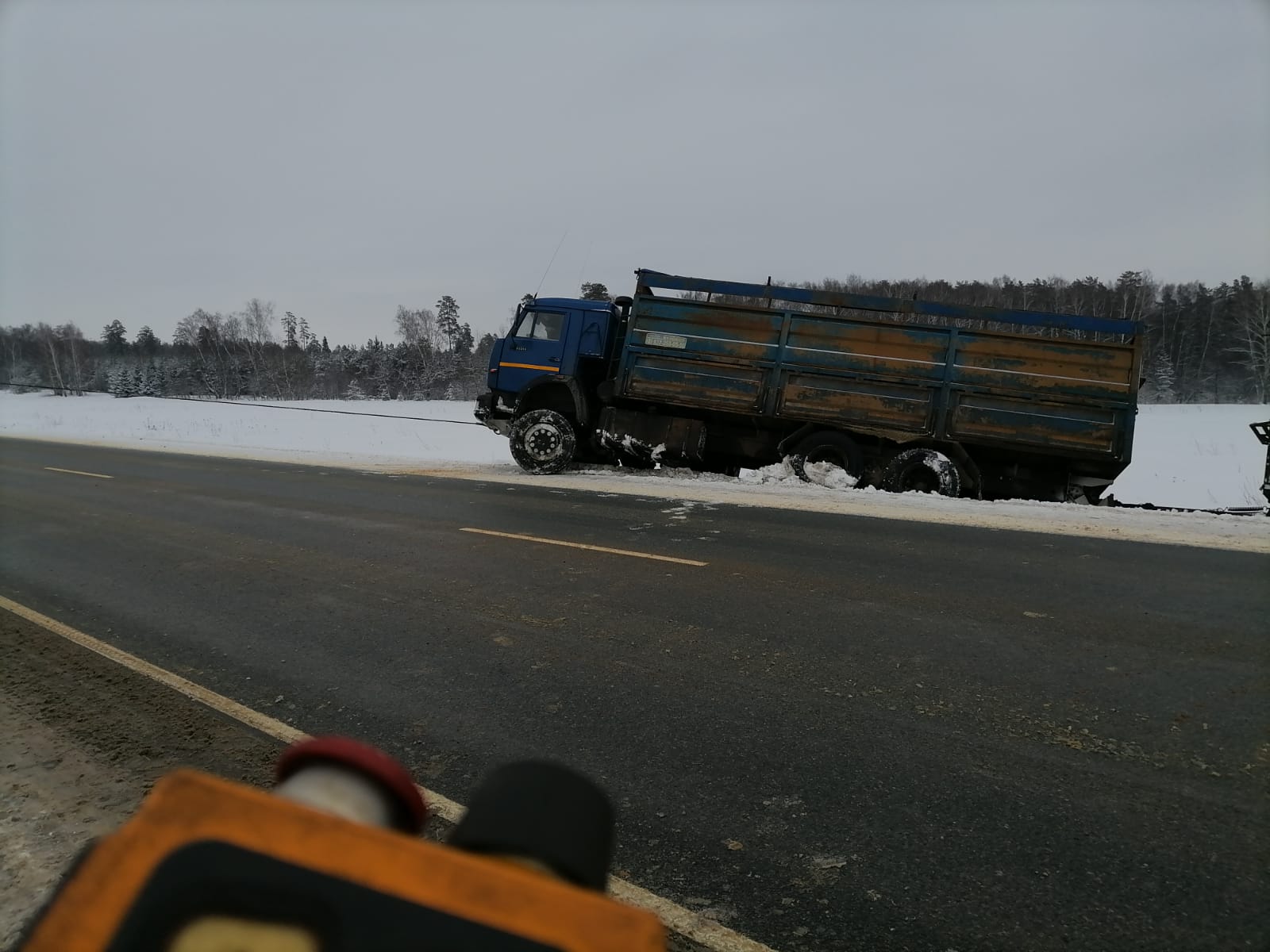 В диспетчерскую службу “Буксир-112” поступил звонок от водителя грузовой машины с просьбой помочь его транспортному средству. Он остановился на обочине, но не заметил, что снег под колесами сильно рыхлый, что и послужило причиной скатывания прицепа и основной части машины в кювет. Машина практически легла на бок.