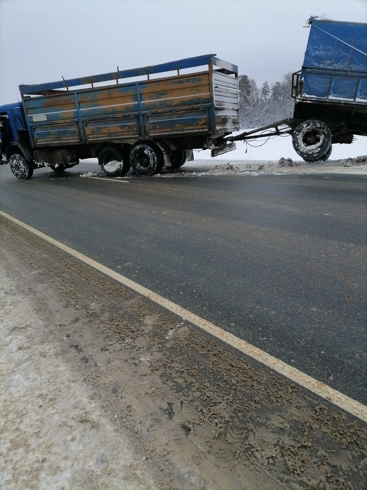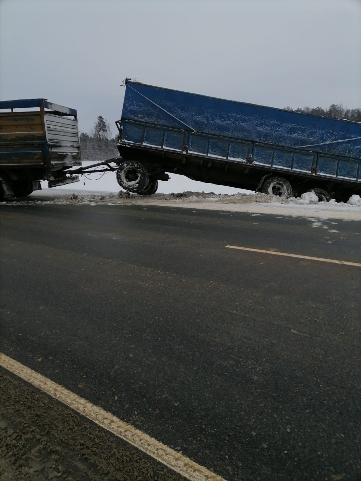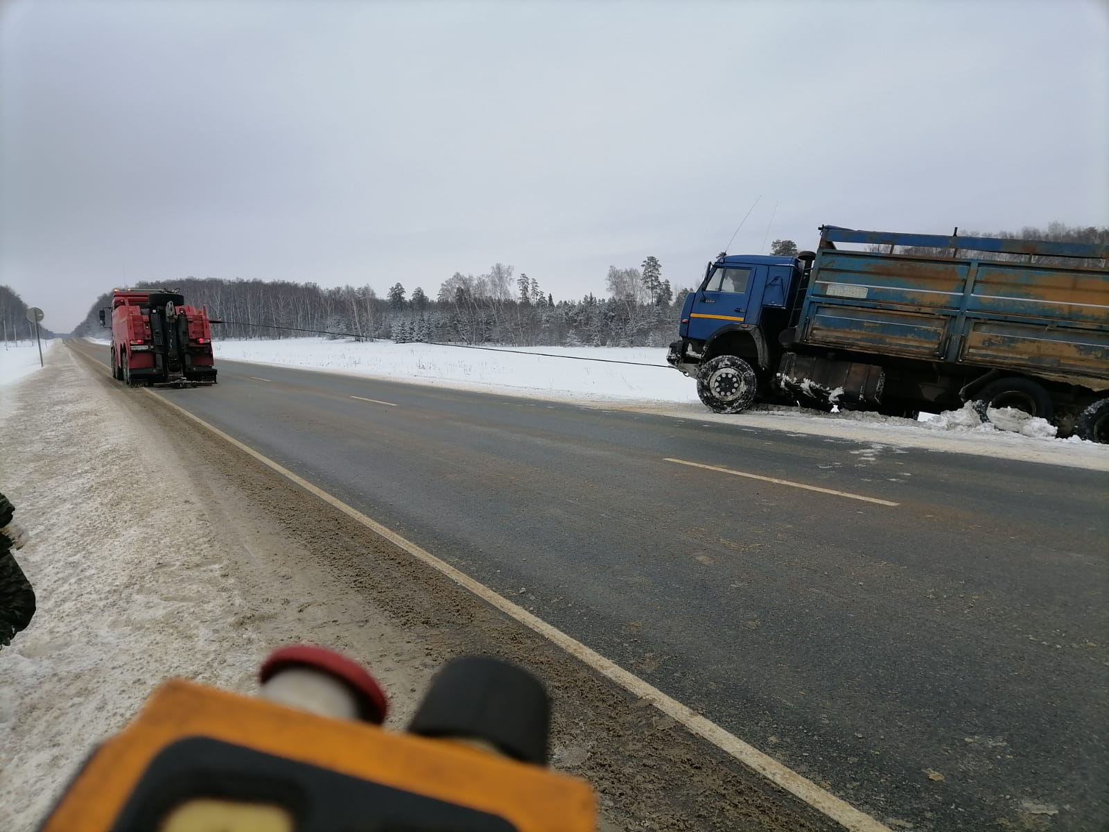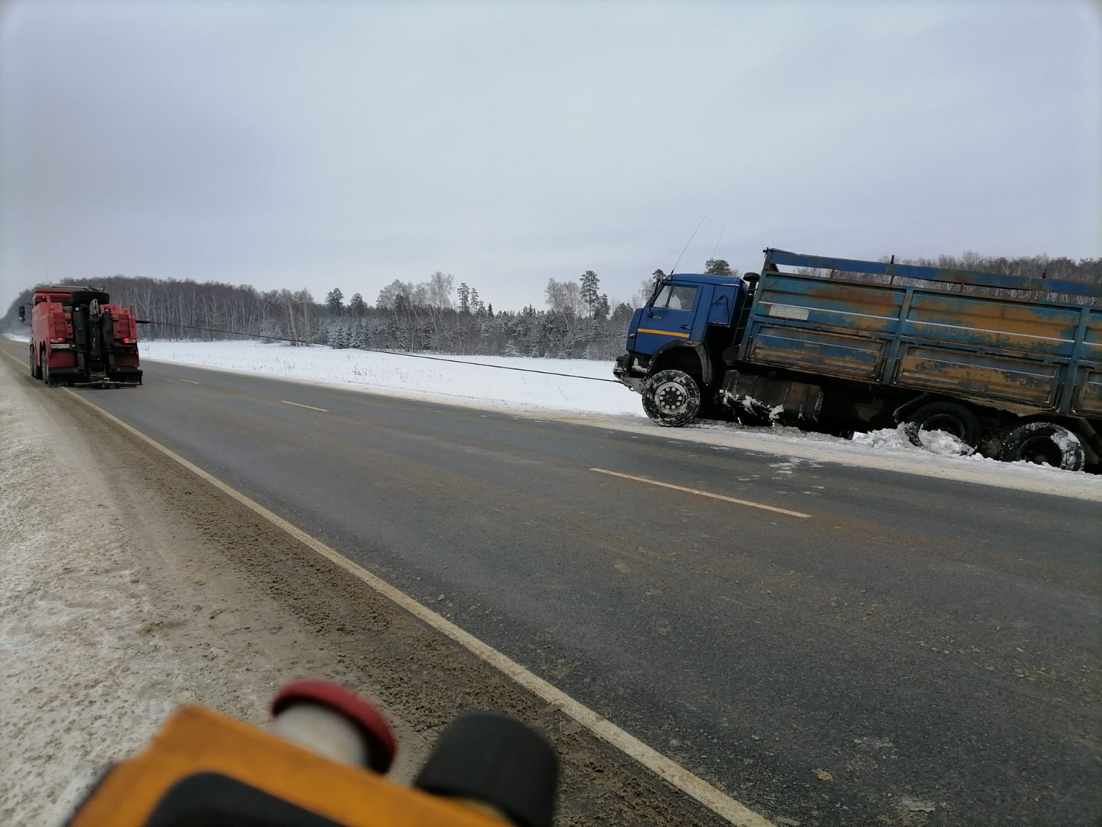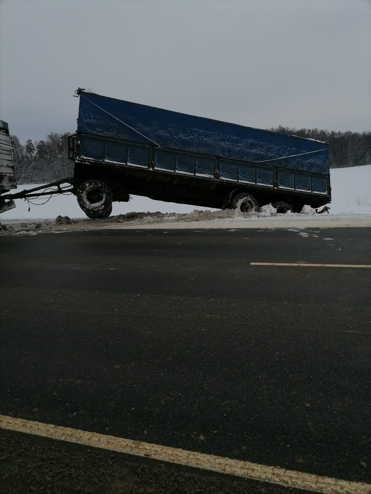 В диспетчерскую службу “Буксир-112” поступил звонок от водителя грузовой машины с просьбой помочь его транспортному средству. Он остановился на обочине, но не заметил, что снег под колесами сильно рыхлый, что и послужило причиной скатывания прицепа и основной части машины в кювет. Машина практически легла на бок.