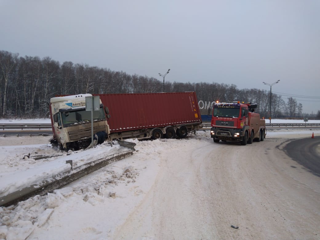 А также с управлением не справился водитель грузового транспортного средства, вследствие чего машина сложилась в виде ножниц. Работали быстро, так как половина фуры лежала на проезжей части. Для начала мы выровняли транспортное средство, а уже потом отбуксировали за переднюю балку до места ремонта.