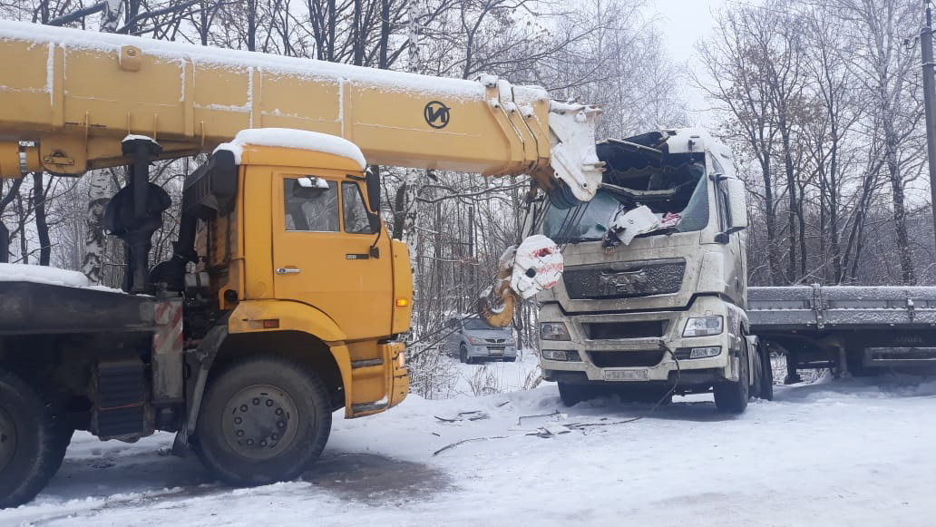 В сильный гололед в Тульской области водитель крана не справился с управлением и влетел в кабину МАНа. Пострадавшее транспортное средство эвакуировали в сервисный центр.