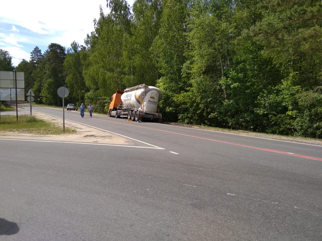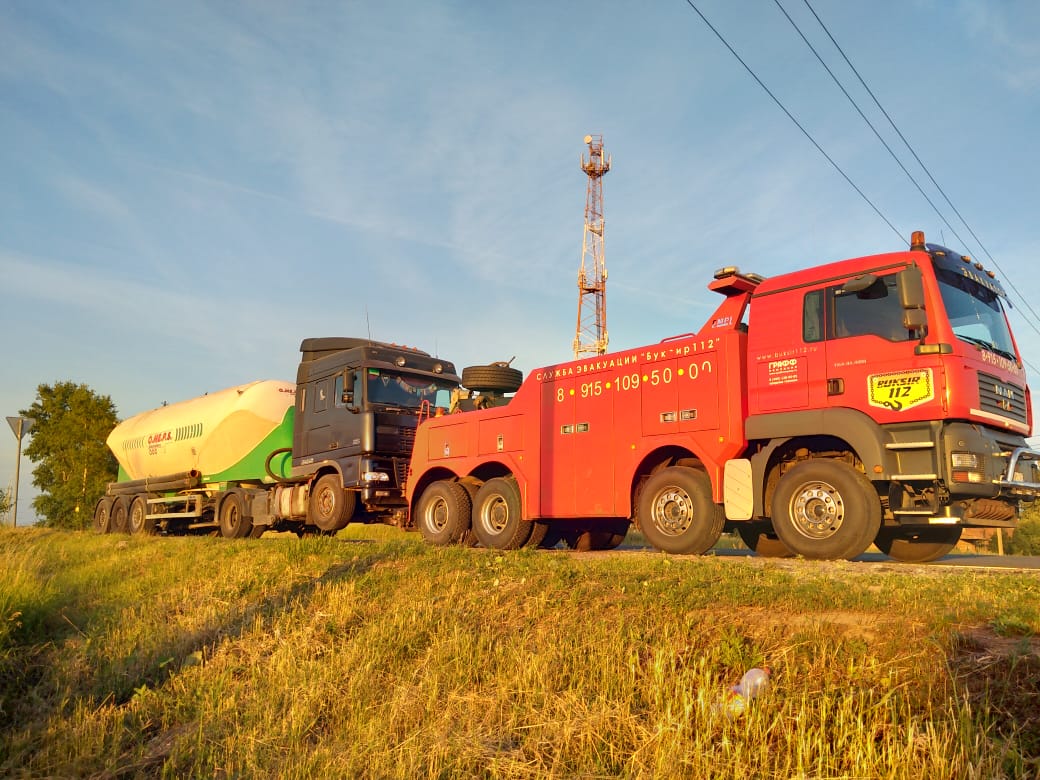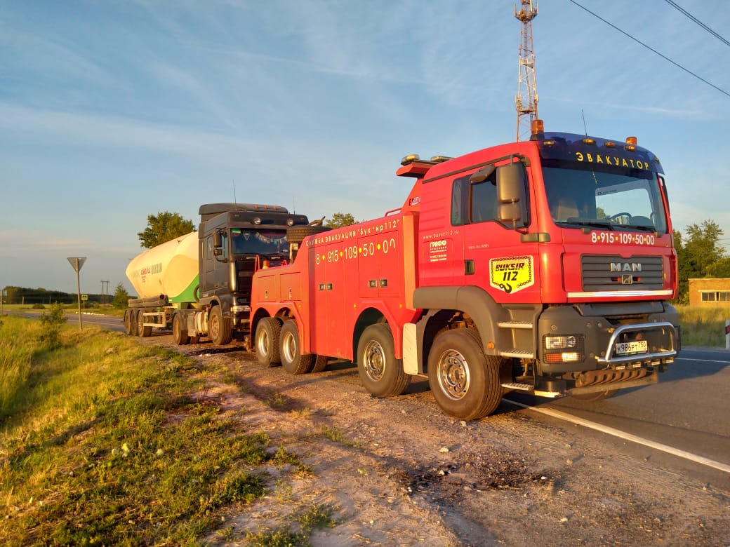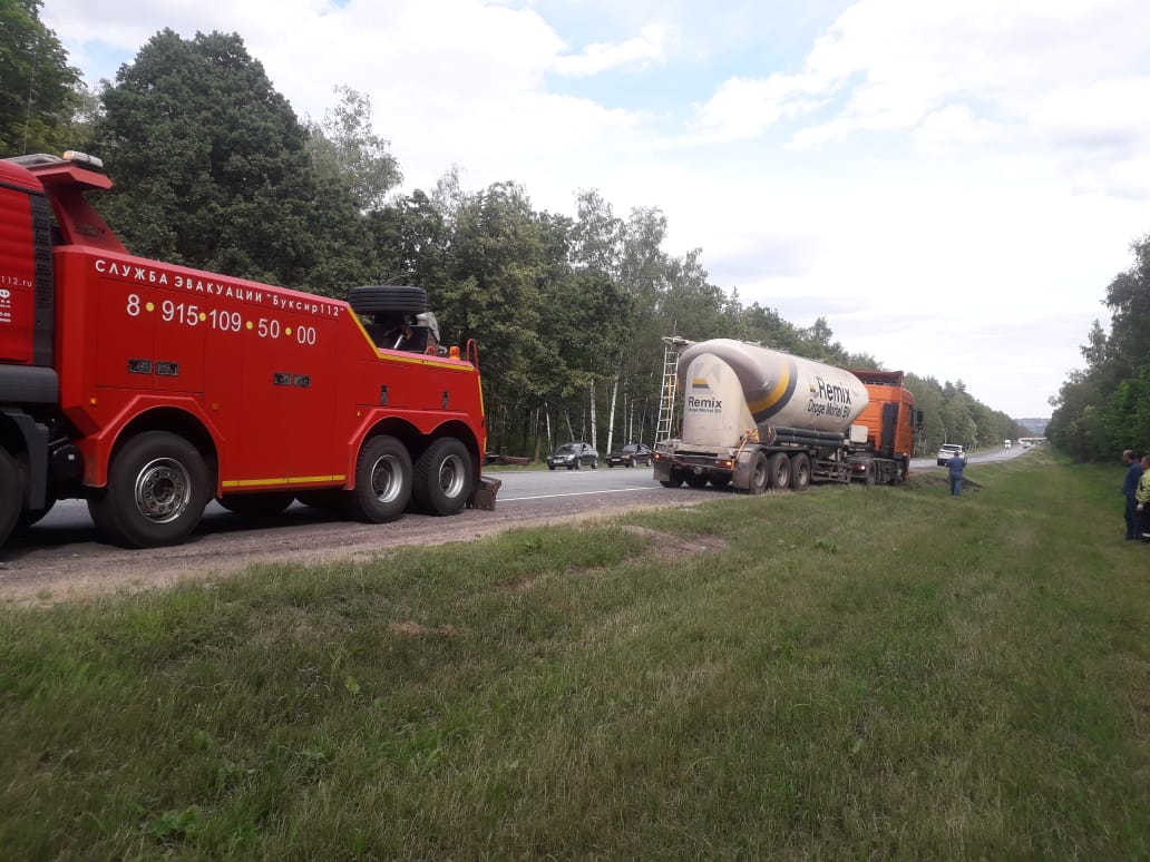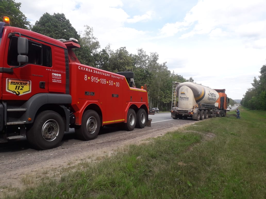 Из-за проблем с двигателем водитель цементовоза не удачно припарковался на обочине. Грузовое транспортное средство было на грани опрокидывания. Водителю пришлось обратиться за помощью в «Буксир-112». Специалисты быстро добрались до места происшествия. Они отбуксировали пустой цементовоз в сервисный центр авто на 91 км трассы М4. Заказ был быстро и качественно выполнен.