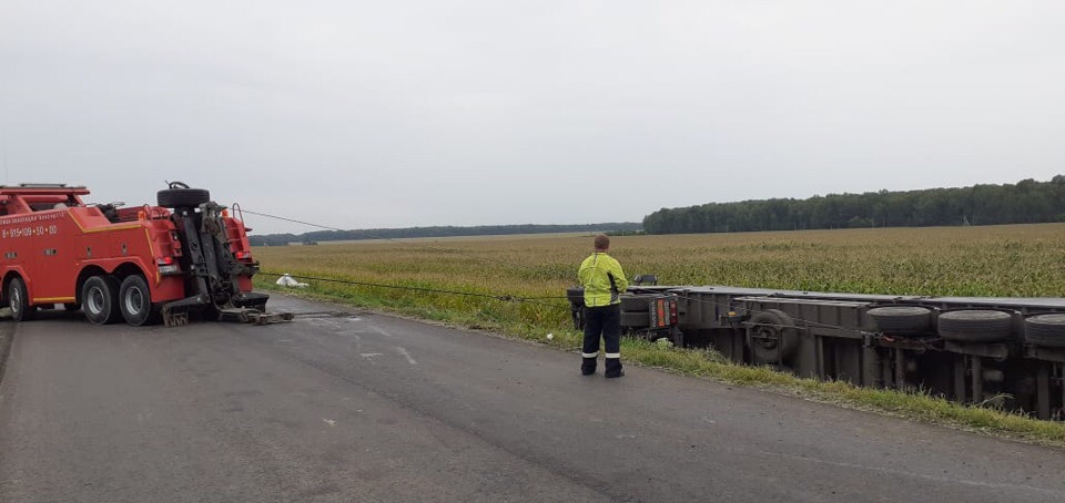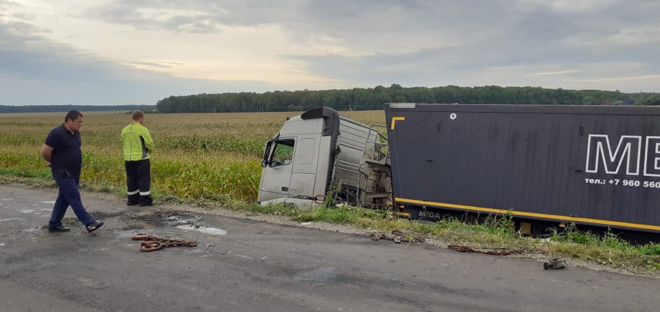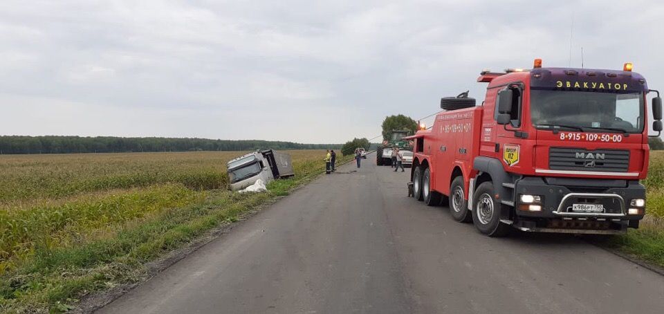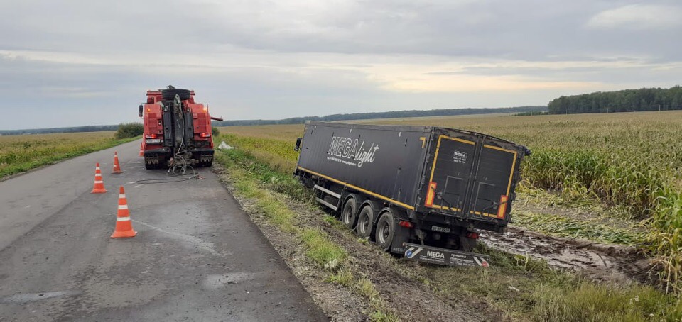 В д. Барыбино Московской области случилось неприятное происшествие. Груженый Тонар не смог разъехаться со встречным легковым автомобилем на узкой дороге. Грузовик зацепил обочину и улетел в кювет. Он упал на бок в кукурузном поле.