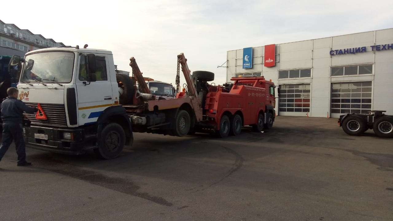 Справиться с таким положением автомобиля самостоятельно он не мог, поэтому вызвал наших буксировщиков. Грузовик сильно пострадал и нужно было отбуксировать его до места ремонта. Однако предварительно нужно было снять его с ограждения.